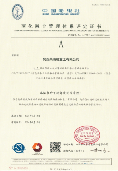 陜柴作為工信部兩化融合管理體系貫標試點企業(yè),于2019年8月正式啟動兩化融合管理體系貫標工作,并于2021年9月通過評定機構(gòu)審核取得評定證書,2022年7月通過評定機構(gòu)監(jiān)督審核,目前體系正常有效運行。