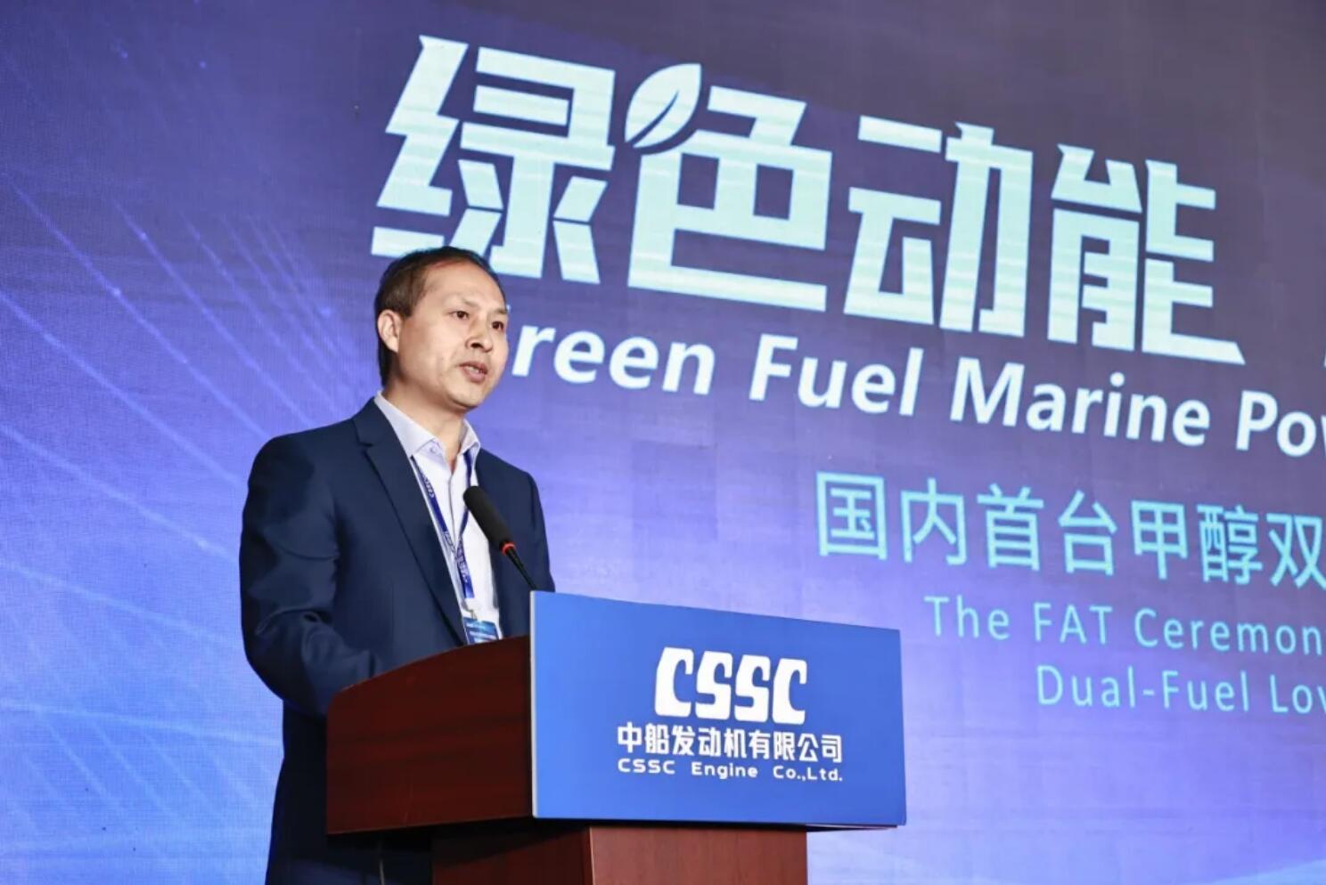 中船發動機黨委書記、董事長付向昭熱情洋溢的歡迎辭拉開了交機儀式的序幕,在中船發動機黨委副書記、總經理楊小強的主持下,集團主管部門領導、BV船級社和船廠代表分別致辭,中國船舶集團綜合技術經濟研究院副院長包張靜作《綠色船用動力發展趨勢與市場機遇》報告,中船發動機黨委委員、副總經理陳義仿介紹了中船發動機低碳零碳發動機布局及國內首臺甲醇雙燃料低速機的研制過程。隨著推桿儀式的成功完成,整個交機儀式被推向了高潮,現場氣氛熱烈高漲,與會嘉賓一齊鼓掌,慶祝國內首臺甲醇雙燃料低速機成功交驗!
