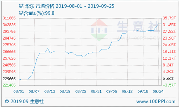 根據(jù)生意社數(shù)據(jù)監(jiān)測顯示:近期國內(nèi)鈷價穩(wěn)中有升。截止9月25日,鈷價報價3043333.34元/噸,較9月10日鈷價報價均價291000元/噸,漲幅4.58%。近期鈷價受國際鈷價上漲影響,穩(wěn)中有升。