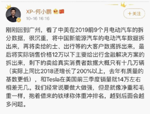 日前,小鵬汽車董事長何小鵬在其官方賬號上發(fā)文稱, 2019年前9個月,中國新能源汽車市場的電動汽車實(shí)際賣給消費(fèi)者的數(shù)據(jù)大概只有十幾萬輛,和特斯拉前三季度在美國市場14萬輛的銷量相差無幾(考慮到中美人口的數(shù)量差異以及新)。原文見下圖: