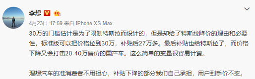 理想汽車CEO李想在微博中直言,“30萬元的門檻估計是為了限制特斯拉而設計的,但是卻給了特斯拉降價的理由和必要性。”小鵬汽車董事長何小鵬亦預判,“年內Model3長續航版會降價到27.75萬”。
