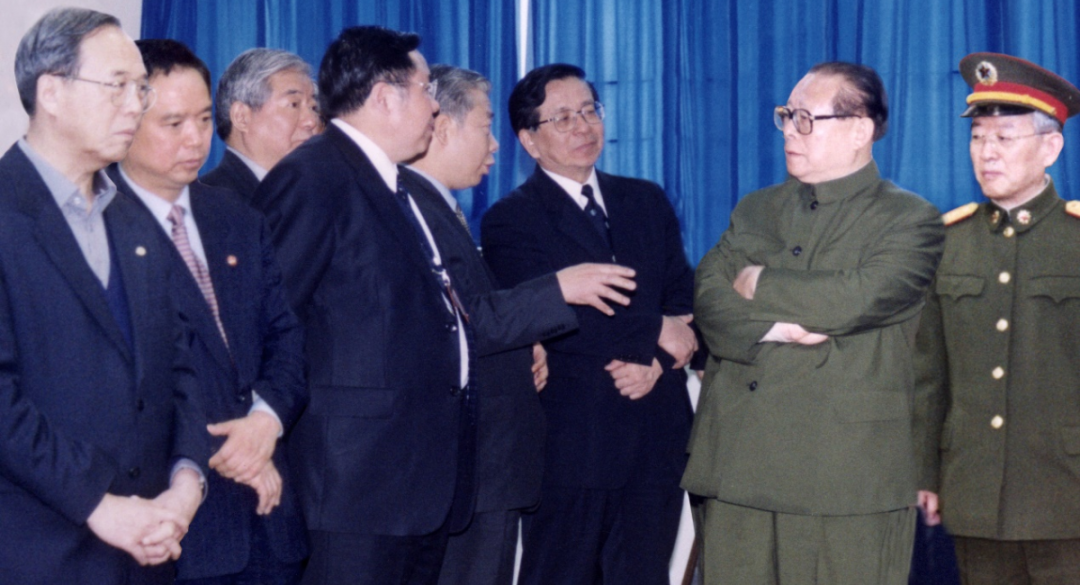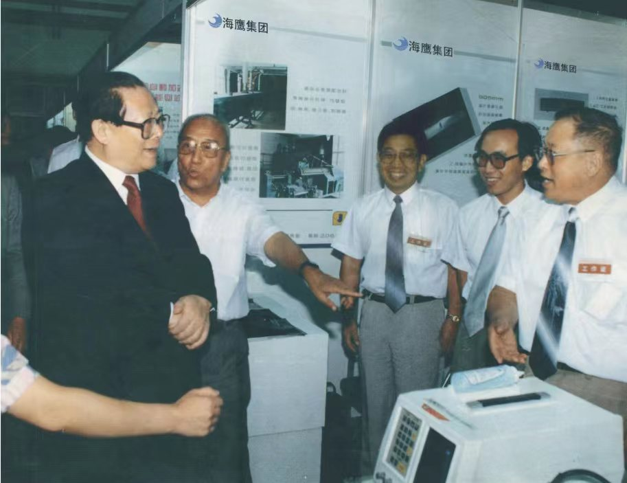 江澤民同志曾參觀系統工程研究院、中船電科旗下海鷹公司產品。圖為1995年,江澤民同志參觀海鷹公司展臺。